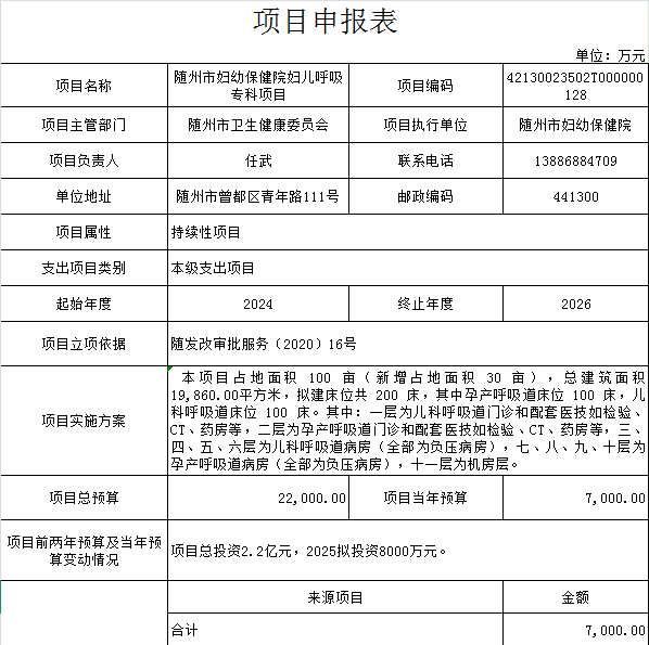 1.2025年預算安排7000萬元,資金來源為單位事業收入資金。2024年隨州市婦幼保健院為了有效開展工作,維護全市婦女兒童的健康,盤活存量資產,我院計劃新建呼吸專科,從根本上解決業務用房不足、布局不合理的難題。該項目建設地址為隨州市曾都區蔣家崗社區,位于清河路與鹿鶴大道交會處。計劃用地70畝,總建筑面積4.5萬平方米,其中:地上建筑面積4萬平方米(綜合病房樓2.38萬平方米、門診醫技樓1.44萬平方米、后勤綜合樓0.17萬平方米、污水處理站及垃圾暫存間100平方米);地下室(人防及地下停車)0.5萬平方米。開放病床498張。該項目已在2021年1月20日完成主體封頂,并做好室內深化設計方案,目前正在進行室內裝修。項目建設總投資為1億元,該項目通過產出指標、效益指標、滿意度指標分析,新院建設能增加醫療基礎設施,改善醫療基礎條件,滿足人們日益增長的婦幼需求。項目建成后可從根本上解決隨州市婦幼保健院醫療基礎設施不足的問題,有利于改善該院的基礎設施和醫療設備條件,有利于提高服務水平和確保各項工作順利開展。滿足隨州市婦女兒童保健需求,社會效益好,對婦幼衛生保健事業的發展將產生積極的影響。