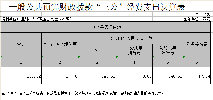 2015年三公經費支出191.62萬元,其中:因公出國(境)費用27.9萬元、公務用車購置及運行維護費146.68萬元、公務接待費17.04萬元。