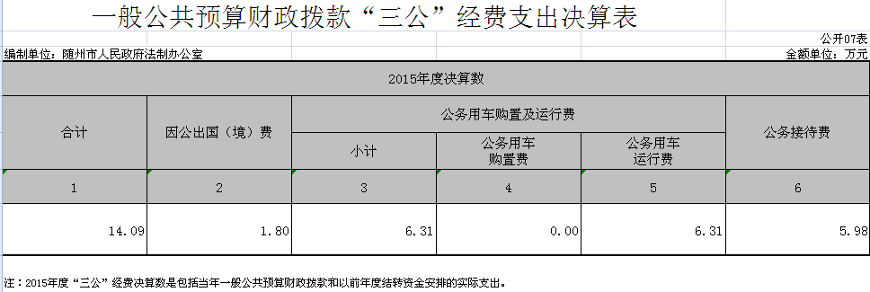 隨州市政府法制辦2015年度“三公”經費總支出14.09萬元,比上年度減少3.6445萬元,“三公”經費開支具體明細如下: (1)2015年度市政府法制辦因公出國(境)人員1人次,此項經費支出1.8萬元。
