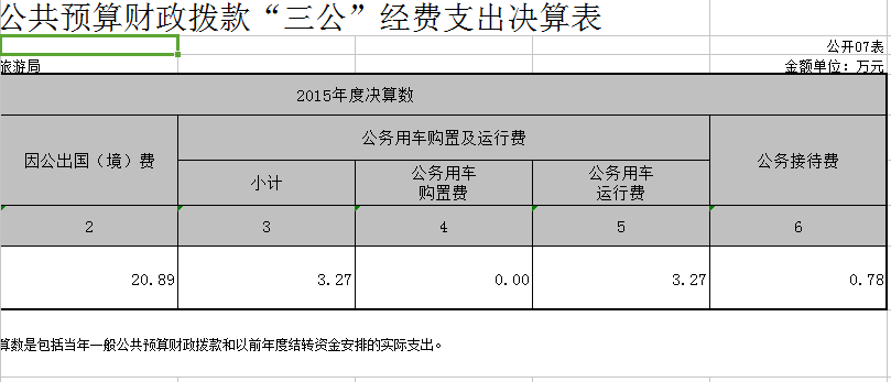 (4)三公經費支出19.14萬元。其中因公出國(境)費15.39萬元(未含曾云峰同志參加的旅游推廣交流活動費用5.5萬元),公務用車運行維護費2.97萬元,公務接待費0.78萬元。