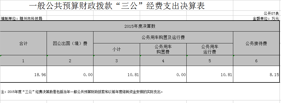 2015年度,市科技局嚴(yán)格執(zhí)行中央八項(xiàng)規(guī)定和省、市有關(guān)黨風(fēng)廉政精神,強(qiáng)化支出管理,厲行節(jié)約,“三公”經(jīng)費(fèi)同比下降21.26%,具體為: