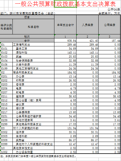 2015年財政撥款支出決算683.56萬元,在人員增加,工資調整的增支情況下,機關嚴格控制其他經費支出,與2014的756.8萬元相比減少支出73.24萬元。其中:基本支出608.84萬元,與上年相比減少93.6萬元,用于委機關的日常運轉的支出;其中:工資福利支出289.46萬元,占全年總支出的42.34%,比上年增加24.66萬元;商品和服務支出184.92萬元,比上年減少77.48萬元,其中辦公費同比較少2.6萬元、印刷費同比增加5.5萬元、水電及有點費用基本持平,差旅費用增加13萬元,由于因公出國經費支出比上年減少10.35萬元,公務接待費用同比大幅下降,由58萬元降至13.7萬元,降幅達58%。公車運行費用也大幅下降,從2014年的47.5萬元降至34.3萬元,降幅達46.7%。主要是減少接待費和壓縮會議開支;對個人和家庭補助支出131.94萬元,比上年增加43.16萬元,主要是增加退休干部人員以及退休人員工資的正常調整;項目支出74.72萬元,用于信息化建設中心、援疆及固定資產投資評審、出國考察等經費支出。與上年相比增加20.38萬元,主要是機關信息化建設等項目支出。