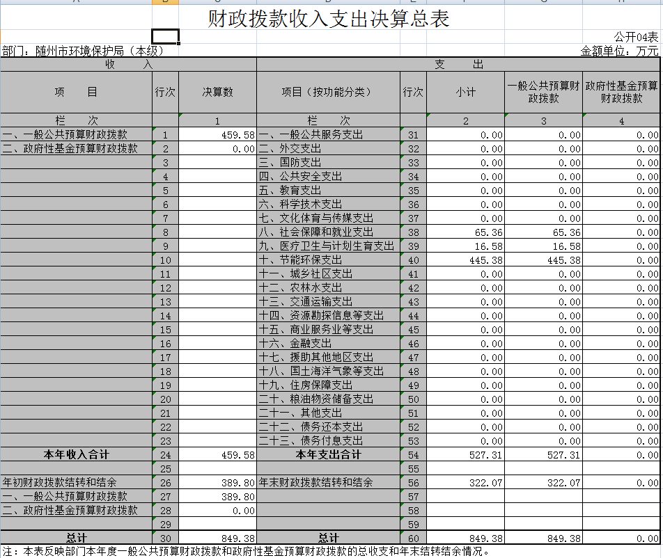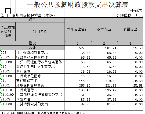 2016年決算收入合計966.09萬元,財政撥款收入459.58萬元。決算支出合計563.38萬元(基本支出501.74萬元,項目支出61.64萬元),其中行政運行195.47萬元,其他環境保護事務支出198.04萬元,社會保障及離退休65.36萬元,行政單位醫療16.58萬元,污染防治支出87.93萬元。