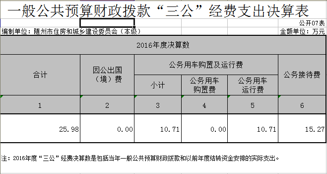 2016年隨州市住建委“三公”經費合計25.98萬元,比上年的19.48萬元增加了6.5萬元。其中因公出國支出6.7萬元(因公出國(境 )費用6.7萬元,此費用為省政府于2015年12月7日批準,2016年元月成行);公務用車運行費10.71萬元,比上年減少了2.82萬元,主要是因為公車改革(公務應急車輛編制為3輛,實有3輛,含1輛離退休干部保障車輛),公務車數量減少,同比下降26.33%;公務接待費15.27萬元,共接待150批次,接待人數2000人次,比上年增加14.75萬元,一是2016年開展農村生活垃圾以及農村生活污水治理,上級調研檢查較多;二是省內住建系統交流學習增多。