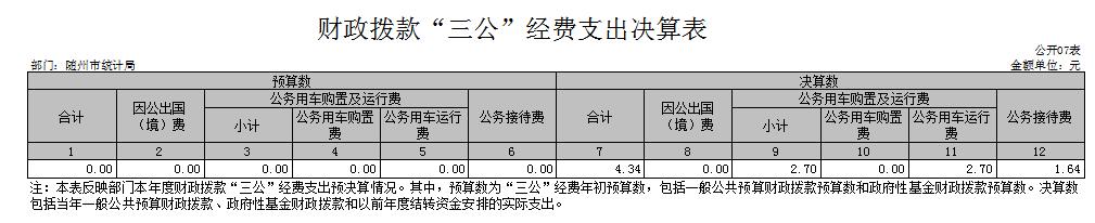 2017年市統計局“三公”經費支出4.34萬元,比上年12.72萬元減少65.88%,比年初預算8.36萬元少48.09%。本年未開支因公出國(境)費,未開支公務用車購置費,與去年無變化,原因是本年無購車計劃和因公出國(境)計劃。