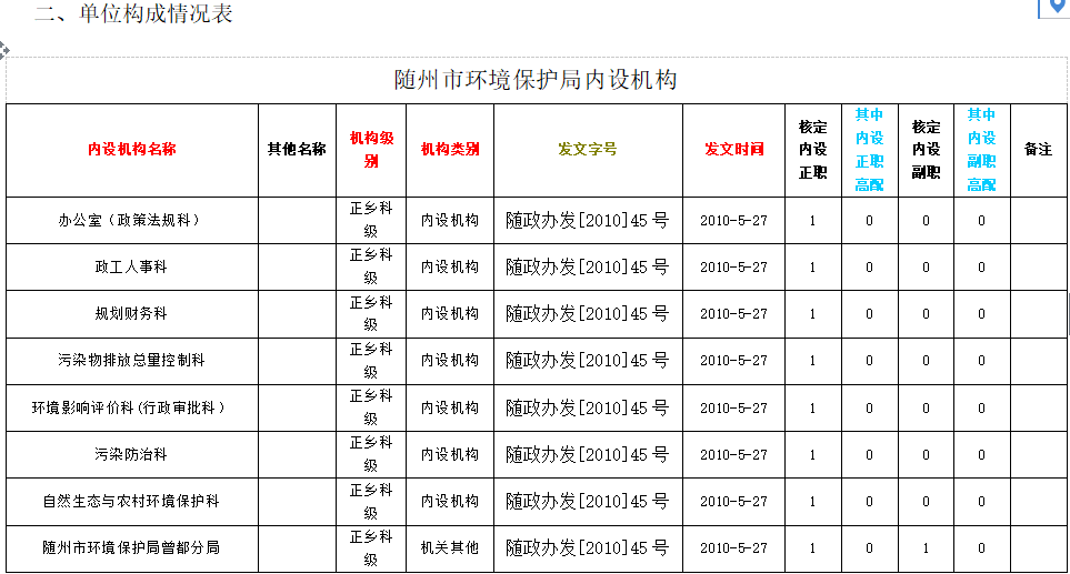 市環境保護局機關行政編制18名(含曾都分局5名),其中局長1名,副局長3名,總工程師1名;正科級領導職數7名。另核定機關“以錢養事”崗位2個。