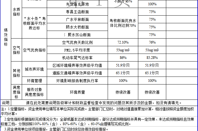 排污費安排的支出項目績效自評:項目全年預算數為1200萬元,執行數為833.8萬元,完成預算的69.48%。主要產出和效果:一是空氣質量省定目標超額完成;二是水環境質量達到省考核要求;