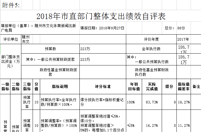 2017年度部門預算整體支出績效評價綜合得分為88分,評價等級為優。