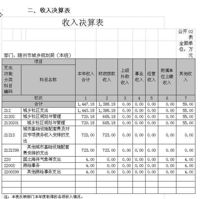 依據《中華人民共和國預算法》、《財政部關于印發(fā)<地方預決算公開操作規(guī)程>的通知》(財預[2017]143號)和《市財政局關于做好2017年度市級部門決算信息公開工作有關事項的通知》(隨財函[2018]152號)要求,現(xiàn)對我局2017年部門決算公開如下: