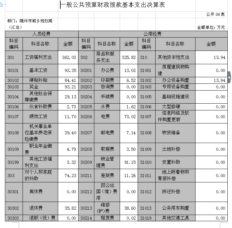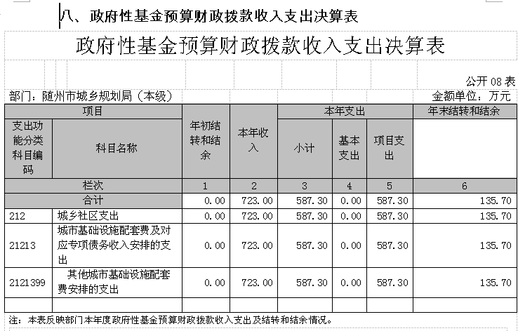 隨州市城鄉(xiāng)規(guī)劃局(本級)2017年初財政預算撥款支出1158.6萬元,財政撥款基本支出調整預算數1388.18萬元,決算數1207.19萬元,執(zhí)行率86.96%;一般公共財政預算撥款調整預算數665.18萬元,決算數619.89萬元,執(zhí)行率93.19%;政府性基金預算財政撥款調整預算數723萬元,決算數587.3萬元,執(zhí)行率81.23%,差異原因為指標結余結轉統(tǒng)籌后撥回。