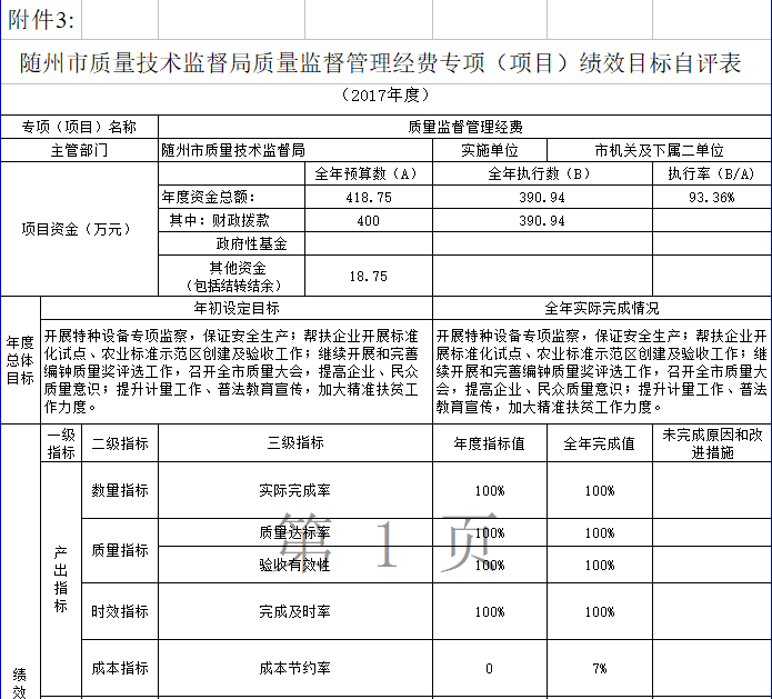 2017年度隨州市質量技術監督局質量監督管理經費財政撥付資金到位400萬元,所撥資金全部用于“質量監督管理經費”項目使用,實際使用390.94萬元,結轉下年9.06萬元(為2017年12月21日下達國庫指標)。質量監督管理經費支出與項目立項申請相一致,達到了項目績效要求。評定結果綜合得分為88分,評價結果類型為A,評價結果級別為優。發現的問題及原因:一是項目績效指標設計需進一步加強;二是項目管理制度需進一步完善。下一步改進措施:一是進一步加強制度建設;二是進一步健全監控機制。