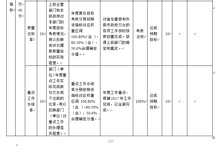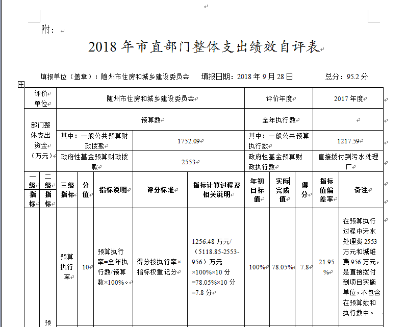 (一)預算績效管理工作開展情況。根據預算績效管理要求,本單位組織對2017年度部門整體支出進行績效自評,從評價情況來看2017年,全市住房和城鄉(xiāng)建設工作在市委市政府的正確領導和省住建廳的指導下,堅持以黨的十八屆五中、六中全會和十九大精神為指導,緊緊圍繞建設區(qū)域性中心城市的目標,搶抓國家和省、市重大戰(zhàn)略機遇,堅持務實重行、開拓創(chuàng)新,圓滿完成了各項工作任務。城市重點工程、棚改和保障性住房、建設領域管理、城市“雙修”和農村“雙治”、干部作風能力建設等各項工作競進提質,建筑質量安全管理、住建調研宣傳工作在全省作經驗交流發(fā)言,保障性住房、村鎮(zhèn)建設等工作走在全省前列。根據《2018年市直部門整體支出績效自評表》中績效指標分析評分,隨州市住房和城鄉(xiāng)建設委員會2017年部門整體支出績效自評得分95.2分,績效評價等級為優(yōu)。