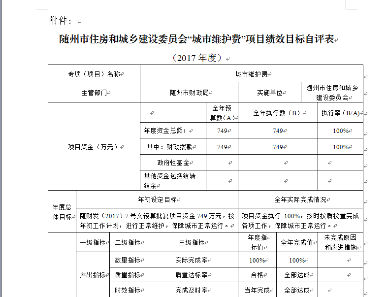 (二)城市維護費支出項目績效自評:城市維護費項目全年預算數為749萬元,由市財政直接撥付到項目資金使用單位。其中:市園林局157萬元、市房產局10萬元、市政管理處333萬元、市排水處135萬元、市建筑工程質量和安全監(jiān)督站10萬元、市城建檔案館10萬元、市住建委94萬元。項目預算資金實際使用749萬元,預算執(zhí)行率100%。