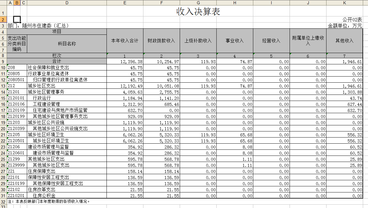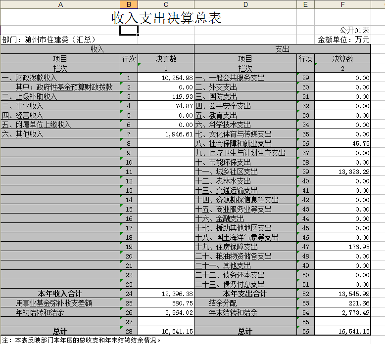 2017年隨州市住建系統(tǒng)(匯總)部門收入16541.15萬元,比上年決算收入的22346.22萬元減少了5805.07萬元,同比下降了25.98%。主要原因是大部分項目支出資金在實際執(zhí)行過程中并未撥付到本單位,具體為全市污水處理及設備維護基金直接撥付到污水處理廠,部分城市維護費直接撥付到各項目實施單位。其中財政撥款收入10254.98萬元,占比62%,比年初預算10956.54萬元少701.56萬元;上級補助收入119.93萬元,占比0.72%;事業(yè)收入74.87萬元,占比0.45%;其他收入1946.61萬元,占比11.77%;用事業(yè)基金彌補收支差額580.75萬元,占比3.51%;年初結轉和結余3564.02萬元,占比21.55%。