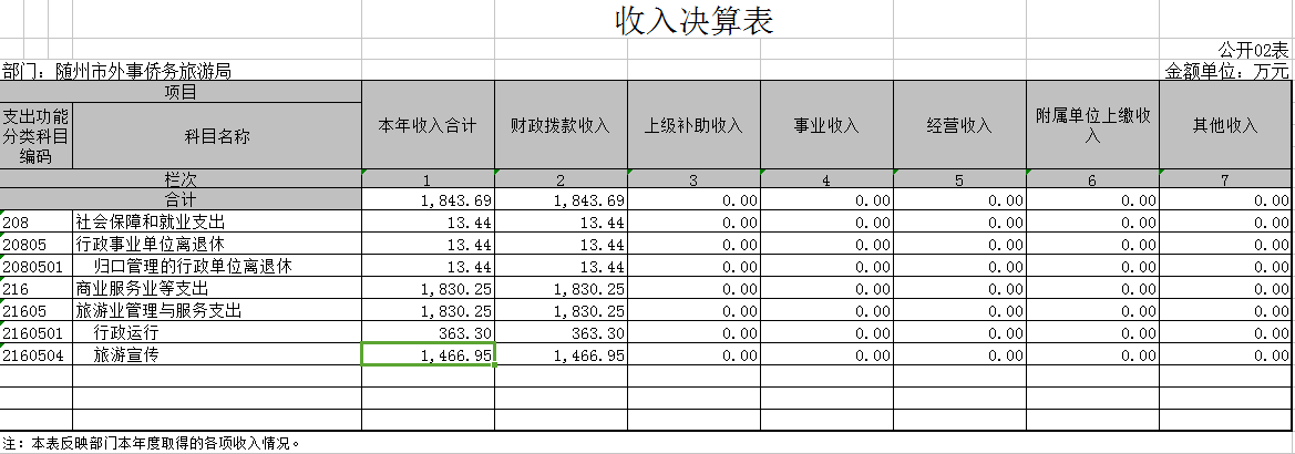 本年度決算收入總計1843.69萬元,其中歸口管理的行政單位離退休13.44萬元,較2016年24.63萬元減少11.19萬元,減少的原因是:自2017年7月份退休人員退休金由人社部門直接支付;旅游業(yè)管理與服務支出1830.25萬元(行政運行363.3萬元較2016年253.18萬元增加110.12萬元;旅游宣傳1466.95萬元較2016年709.07萬元增加757.88萬元,增加106.88%),較2016年962.25萬元增加868萬元,增加90.2%,主要原因是2017年隨州市參加央視首屆魅力中國城評選,市財政增加參賽經費預算,局機關列支旅游宣傳促銷經費。
