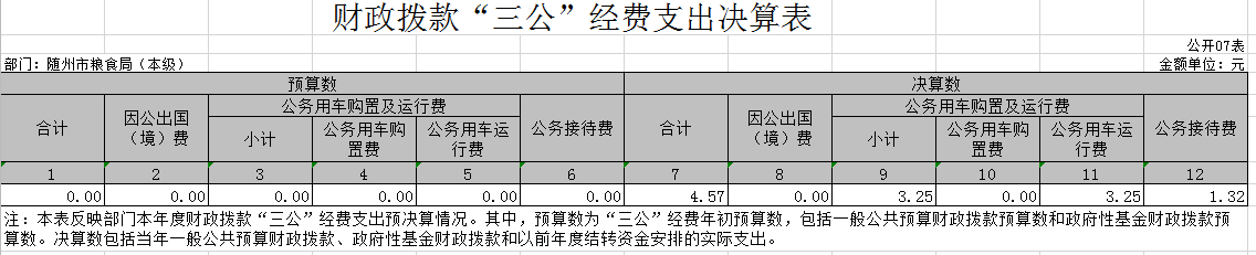 隨州市糧食局本級2017年財政撥款“三公”經費支出4.57萬元,比年初預算減少1.95元,減少29.91%,主要原因是:嚴格控制經費開支,年初財政撥款預算因公出國(境)費用1.5萬元,2017年度實際未開支;比上年支出增加4.57萬元,增加100%,主要原因是: 2016年度財政資金撥款不足,三公經費開支全部用其他收入支付。其中:
