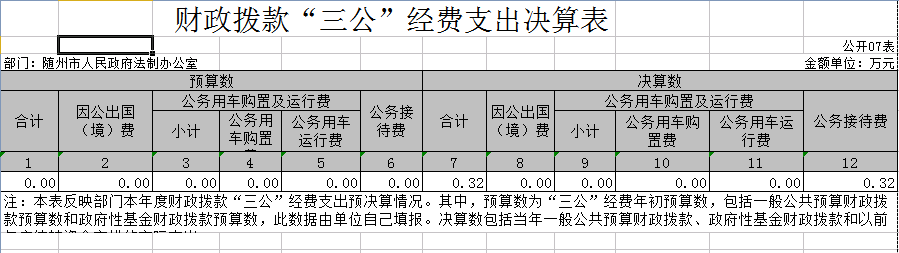 隨州市政府法制辦2018年度“三公”經(jīng)費(fèi)總支出0.32萬(wàn)元,比上年度減少0.81萬(wàn)元,“三公”經(jīng)費(fèi)開(kāi)支具體明細(xì)如下:(1)公務(wù)用車(chē)運(yùn)行費(fèi)0萬(wàn)元。主要是法制辦沒(méi)有公車(chē),原有的兩輛公務(wù)用車(chē)全部移交政府公車(chē)平臺(tái)。(2)公務(wù)接待費(fèi)0.32萬(wàn)元。(國(guó)內(nèi)公務(wù)接待6批次46人次,無(wú)外事接待),經(jīng)費(fèi)開(kāi)支控制在年初預(yù)算范圍內(nèi),公務(wù)接待費(fèi)比上年度減少0.81萬(wàn)元,主要是2018年度市法制辦進(jìn)一步嚴(yán)格了公務(wù)活動(dòng)接待。(3)2018年無(wú)因公出國(guó)(境)支出。