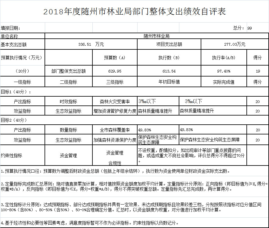 按照《市財政局關(guān)于開展2018年度市級財政支出績效自評工作的通知》(隨財發(fā)〔2019〕9號)文件精神。我局高度重視此次績效評價工作,根據(jù)市財政局文件精神和要求,加強組織領(lǐng)導(dǎo),林業(yè)局分管領(lǐng)導(dǎo)負(fù)責(zé),采用成本效益、因素分析、專家評議、比較等辦法,堅持定量與定性相結(jié)合的原則,確保自評結(jié)果真實、準(zhǔn)確、客觀。