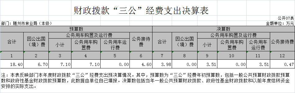 2、市林業(yè)局。2018年“三公”支出合計3.98萬元,是年初預(yù)算18.4萬元的21.63%,2017年“三公”支出7.86萬元,2018年“三公”較上年支出減少3.88萬元,下降49.36%,“三公”經(jīng)費呈下降趨勢,主要原因隨州市林業(yè)局落實中央八項規(guī)定,從嚴(yán)從緊“三公”支出。