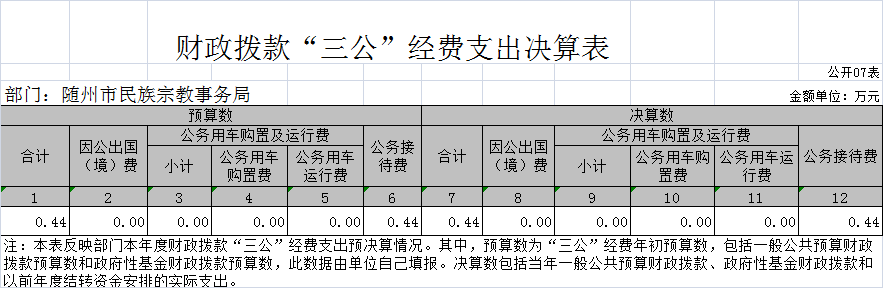 隨州市民宗局2018年度“三公”經費總支出0.44萬元,與年初預算持平,比上年度減少 0.98萬元,減少69%,減少原因是本年度進一步壓縮了公務接待支出。