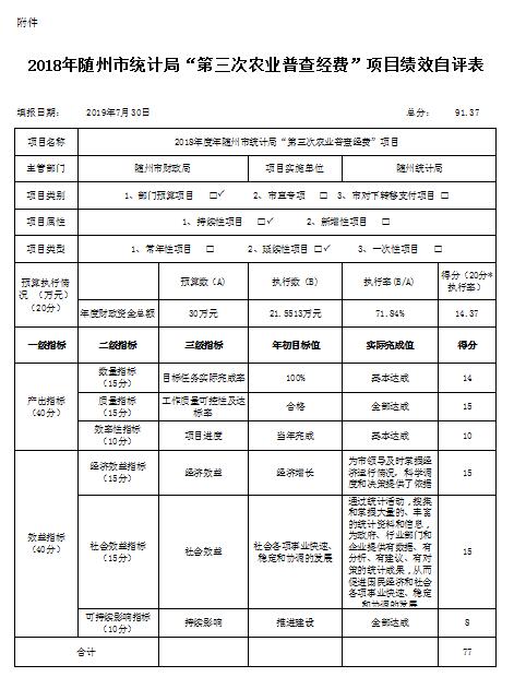 根據(jù)《2018年市統(tǒng)計局“第三次農(nóng)業(yè)普查經(jīng)費”項目績效自評表》中績效指標(biāo)分析評分,隨州市統(tǒng)計局2018年度“第三次農(nóng)業(yè)普查經(jīng)費”項目績效自評得分91.37分,績效評價等級為優(yōu)。