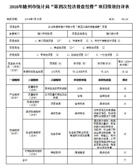 根據(jù)《2018年市統(tǒng)計局“第四次經(jīng)濟普查經(jīng)費”項目績效自評表》中績效指標(biāo)分析評分,隨州市統(tǒng)計局2018年度“第四次經(jīng)濟普查經(jīng)費”項目績效自評得分92.24分,績效評價等級為優(yōu)。