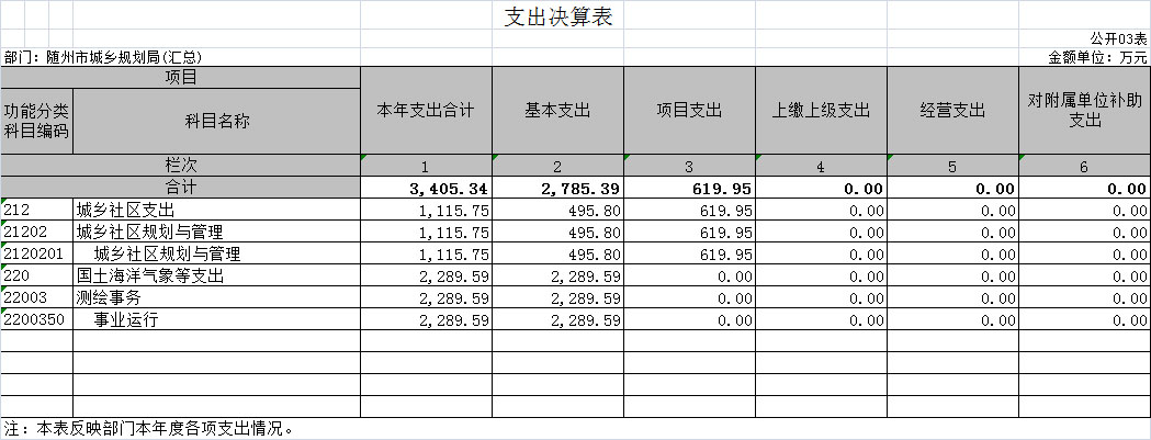 隨州市城鄉規劃局(匯總)2018年支出合計3405.34萬元,其中基本支出2785.39萬元,項目支出數619.95萬元。較上年3882.07萬元增加12.28%,主要原因是項目支出增加。