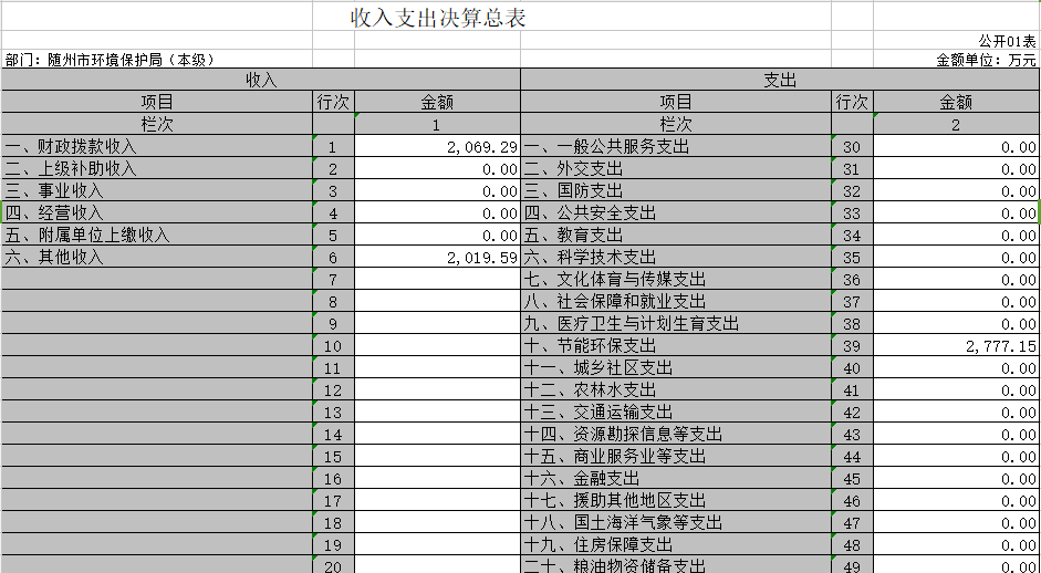 2018年環保局系統納入部門決算管理單位5個,分別為市環保局(含機動車排氣污染監督管理中心)、市環保局曾都分局、市環境監察支隊、市環境保護監測站、市環保局高新園區分局。本級單位行政人員編制18人,實有人員17人,離退休人數14人。市機動車排氣污染監督管理中心(與局機關統一核算)事業人員編制3人,實有人員3人。