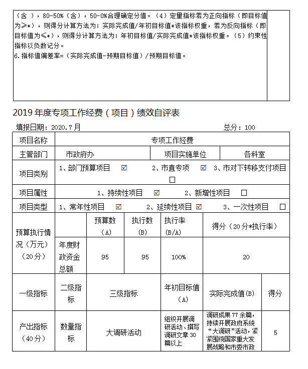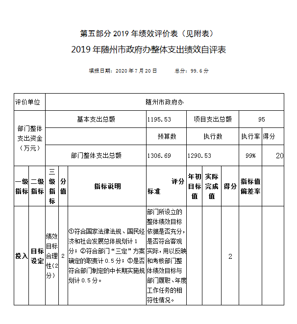 (1)組織開展部門整體支出績效評價情況。市政府辦對2019年度一般公共預(yù)算組織開展部門整體支出績效評價,根據(jù)《2019年市直部門整體支出績效自評表》中績效指標(biāo)開展細(xì)化評分,2019年市政府辦部門整體支出績效自評得99.6分,績效等級為優(yōu)。