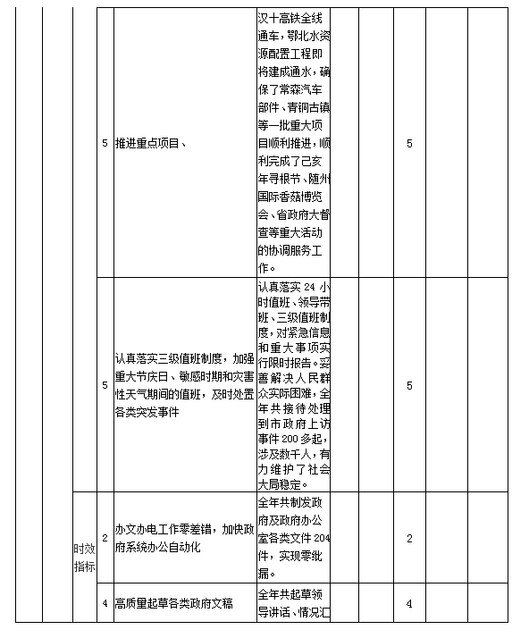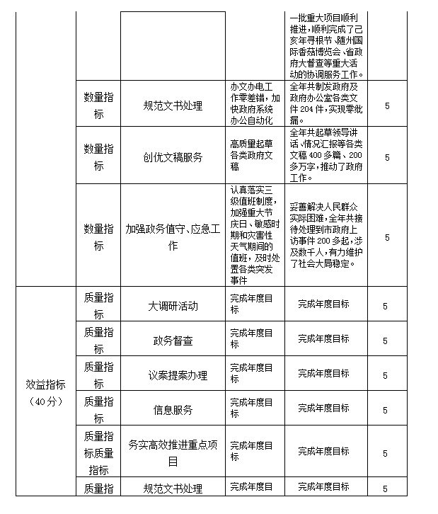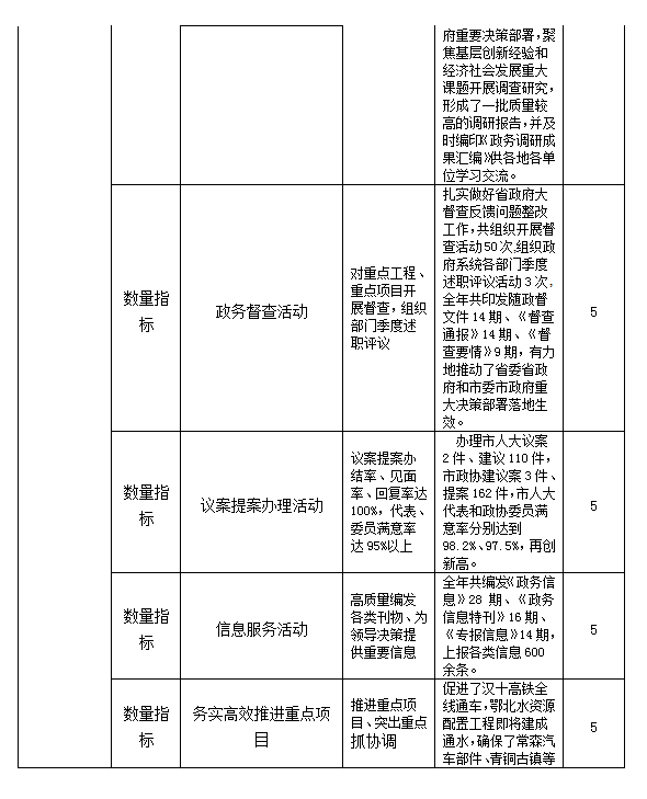 主要產(chǎn)出和效益:1、持續(xù)開展政府系統(tǒng)“大調(diào)研”活動,緊緊圍繞國家重大發(fā)展戰(zhàn)略和市委市政府重要決策部署,聚焦基層創(chuàng)新經(jīng)驗和經(jīng)濟(jì)社會發(fā)展重大課題開展調(diào)查研究,形成了一批質(zhì)量較高的調(diào)研報告,并及時編印《政務(wù)調(diào)研成果匯編》供各地各單位學(xué)習(xí)交流。2、狠抓信息服務(wù)。全年編發(fā)本級《政務(wù)信息》28期,《政務(wù)信息特刊》16期,《專報信息》14期,上報省政府辦公廳信息600多條,其中,被省政府辦公廳采用77條,被國務(wù)院辦公廳采用17條,有1條獲國務(wù)院領(lǐng)導(dǎo)批示,1條獲省政府領(lǐng)導(dǎo)批示,3條獲市政府領(lǐng)導(dǎo)批示。3、規(guī)范文稿制發(fā)。全年共制發(fā)政府及政府辦公室各類文件204件,均做到了政策把握準(zhǔn)確、文字邏輯嚴(yán)密、文件格式規(guī)范,實(shí)現(xiàn)零紕漏。4、創(chuàng)優(yōu)文稿服務(wù)。倡導(dǎo)落實(shí)“短、實(shí)、新”優(yōu)良文風(fēng),全年共起草領(lǐng)導(dǎo)講話、情況匯報等各類文稿400余篇,較好把握了當(dāng)前實(shí)際,發(fā)揮了推進(jìn)工作、加快發(fā)展的積極作用。5、加大督辦力度。突出抓好國務(wù)院“六穩(wěn)”工作部署和省市《政府工作報告》重點(diǎn)工作、省市領(lǐng)導(dǎo)重要批示件的督辦落實(shí),組織政府系統(tǒng)各部門季度述職評議活動3次,開展全市“迎國慶、保軍運(yùn)”信訪維穩(wěn)、“四個三重大生態(tài)工程”、城市重點(diǎn)工程建設(shè)、森林防火等重點(diǎn)督查工作,扎實(shí)做好省政府大督查反饋問題整改工作,全年共印發(fā)隨政督文件14期、《督查通報》14期、《督查要情》9期,有力地推動了省委省政府和市委市政府重大決策部署落地生效。6、認(rèn)真辦理“兩案”。辦理市人大議案2件、人大代表建議110件、市政協(xié)建議案3件、政協(xié)提案162件,積極開展“三見面”、二次辦理、“回頭看”辦理等活動,如期完成辦理任務(wù),市人大代表和政協(xié)委員滿意率分別達(dá)到98.2%、97.5%再創(chuàng)新高。7、嚴(yán)格應(yīng)急值守。認(rèn)真落實(shí)24小時值班、領(lǐng)導(dǎo)帶班、三級值班制度,加強(qiáng)重大節(jié)假日、敏感時期和災(zāi)害性天氣期間的值班,對緊急信息和重大事項實(shí)行限時報告。妥善解決人民群眾實(shí)際困難,全年共接待處理到市政府上訪事件200多起,涉及數(shù)千人,有力維護(hù)了社會大局穩(wěn)定。綜合評價結(jié)論:政務(wù)督查、議案提案辦理、總值班室、信息科、政府工作報告起草、離退休干部、政務(wù)會務(wù)接待、國動辦等專項工作順利有序開展,經(jīng)費(fèi)得到有效保障。