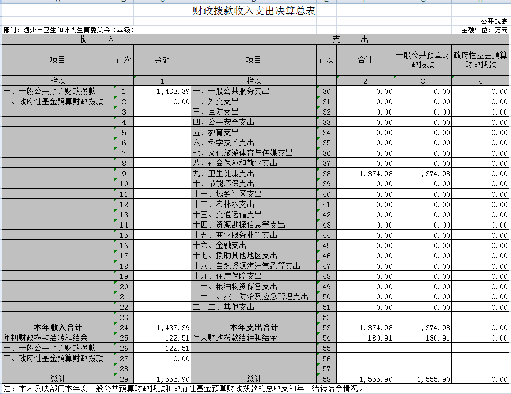 根據《市財政局關于批復2019年度部門決算的通知》(隨財函〔2020〕170號)和《市財政局關于做好2019年度市級部門決算信息公開工作有關事項的通知》(隨財函〔2020〕171號)文件精神,現將隨州市衛生健康委2019年部門決算情況說明如下: