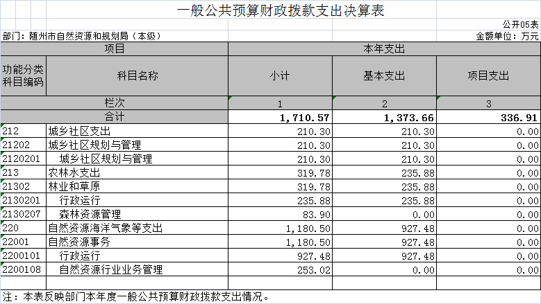 隨州市自然資源和規劃局(本級)2019年一般公共預算財政撥款支出1710.57萬元,其中基本支出1373.66萬元、項目支出336.91萬元。隨州市自然資源和規劃局為2019年4月新組建單位,無上年對比數據。