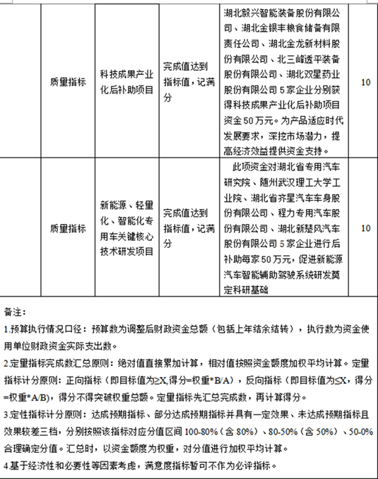 湖北毅興智能裝備股份有限公司、湖北金銀豐糧食儲備有限責任公司、湖北金龍新材料股份有限公司、北三峰透平裝備股份有限公司、湖北雙星藥業股份有限公司5家企業分別獲得科技成果產業化后補助項目資金250萬元,為產品適應時代發展要求,深挖市場潛力,提高經濟效益提供資金支持。隨州市新能源、輕量化、智能化關鍵核心技術研發項目資金250萬元,對湖北省專用汽車研究院、隨州武漢理工大學工業院、湖北省齊星汽車車身股份有限公司、程力專用汽車股份有限公司、湖北新楚風汽車股份有限公司5家企業進行后補助250萬元,促進了我市新能源汽車智能輔助駕駛及車聯網系統開發與應用、新型純電動物流車用半導體冷藏關鍵技術等技術水平提高。