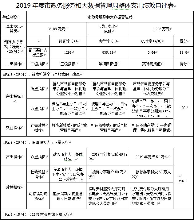 五、2019年度市政務服務和大數據管理局整體支出績效自評表(附后)