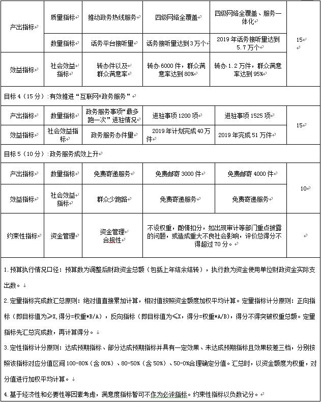 隨州市政務服務和大數據管理局2019年績效目標設立情況:(1)政務服務平臺運行管理工作;(2)12345熱線管理工作;(3)“互聯網+放管服”工作;(4)便民郵寄服務工作。