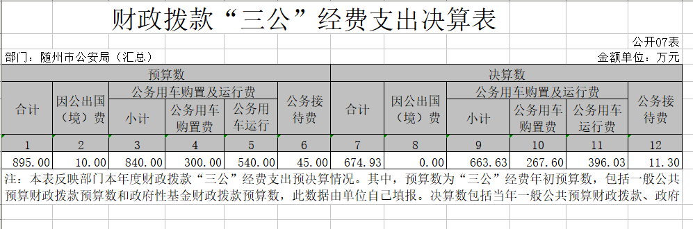 2、2019年隨州市公安局匯總“三公經費”預算支出895萬元,決算支出674.92萬元,決算數比預算數減少220.08萬元,減少24.59%。其中: