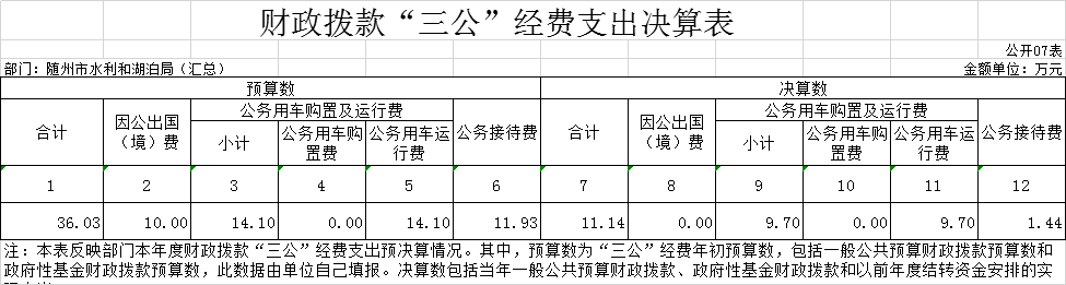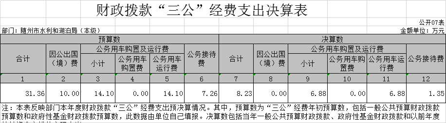 ??截至2019年12月31日,隨州市水利和湖泊局(匯總)共有公務車4輛,其中,一般公務用車2輛,防汛專用車1輛,移動照明車1輛。無公務用車購置費?! ?br/> 隨州市水利和湖泊局(本級)2019年財政撥款“三公”經費支出8.23萬元,比年初預算31.36萬元減少23.13萬元,減少73.76%,比上年14.9萬元減少6.67萬元,減少44.77%。其中:
