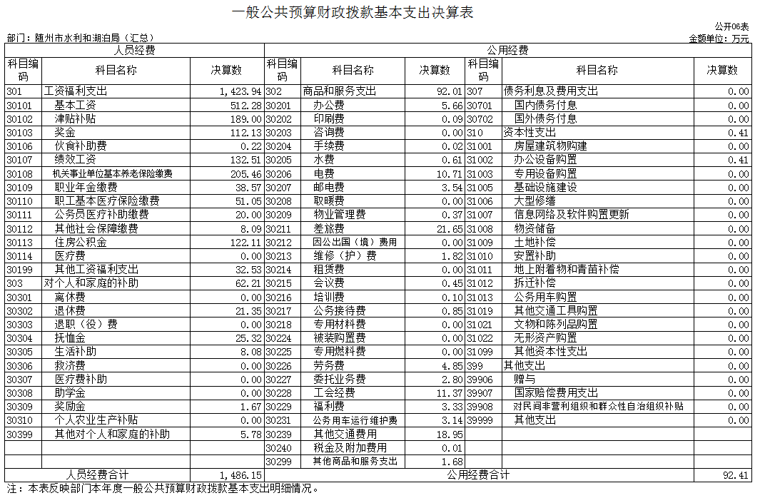 隨州市水利和湖泊局(匯總)2019年度機關運行經費92.01萬元,比預算134.38萬元減少42.37萬元,比上年89.49萬元基本持平,略有增加,主要原因是2019年度部分經費在單位項目中列支,同時厲行節約壓縮一般性開支。其中:辦公費5.66萬元,印刷費0.09萬元,水費0.61萬元,電費10.71萬元,郵電費3.54萬元,物業管理費0.37萬元,差旅費21.65萬元,維修(護)費1.82萬元,會議費0.45萬元,公務接待費0.85萬元,勞務費4.85元,委托業務費2.8萬元,工會經費11.37萬元,福利費3.33萬元,公務用車運行維護費3.14萬元,其他交通費用18.95萬元,其他商品與服務支出1.68萬元。