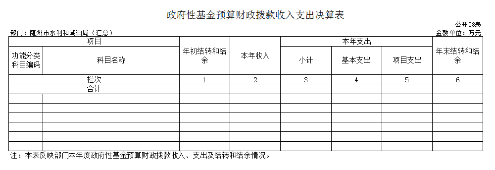 隨州市水利和湖泊局(匯總)無政府性基金預算。隨州市水利和湖泊局(本級)無政府性基金預算。年初預算無政府性基金收入,上年決算也無政府性基金收入。