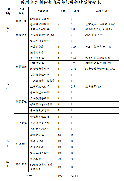 根據《2019年市直部門整體支出績效自評表》中績效目標完成情況評分,隨州市水利和湖泊局2019年部門整體績效評價得分92.14分,評價等級為:優。
