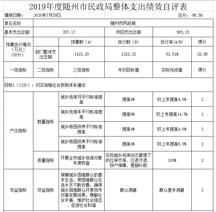 ? 根據(jù)《2019年市直部門整體支出績效自評表》中績效指標分析評分,隨州市民政局2019年部門整體支出績效自評得98.58分,績效等級為優(yōu)。在切實加強社會救助體系建設(shè)、大力發(fā)展慈善公益事業(yè)、加快推進養(yǎng)老服務(wù)業(yè)發(fā)展、全面加強兒童福利保障、切實加強流浪乞討人員救助、提升基層政權(quán)建設(shè)和社區(qū)治理水平、引導(dǎo)社會組織和社會工作健康有序發(fā)展、統(tǒng)籌推進專項社會事務(wù)管理等方面取得良好的社會效益。發(fā)現(xiàn)的問題:一是因部門整體支出的預(yù)算資金安排和使用上仍有不可預(yù)見性,還需加強預(yù)算管理,科學編制預(yù)算;二是工作經(jīng)費短缺,多項工作沒有專項經(jīng)費,影響工作開展;三是加強財務(wù)人員的隊伍建設(shè)和業(yè)務(wù)指導(dǎo),提高績效管理人員業(yè)務(wù)水平,建立績效評價的長期機制。下階段將進一步抓好項目設(shè)置,科學編制預(yù)算。