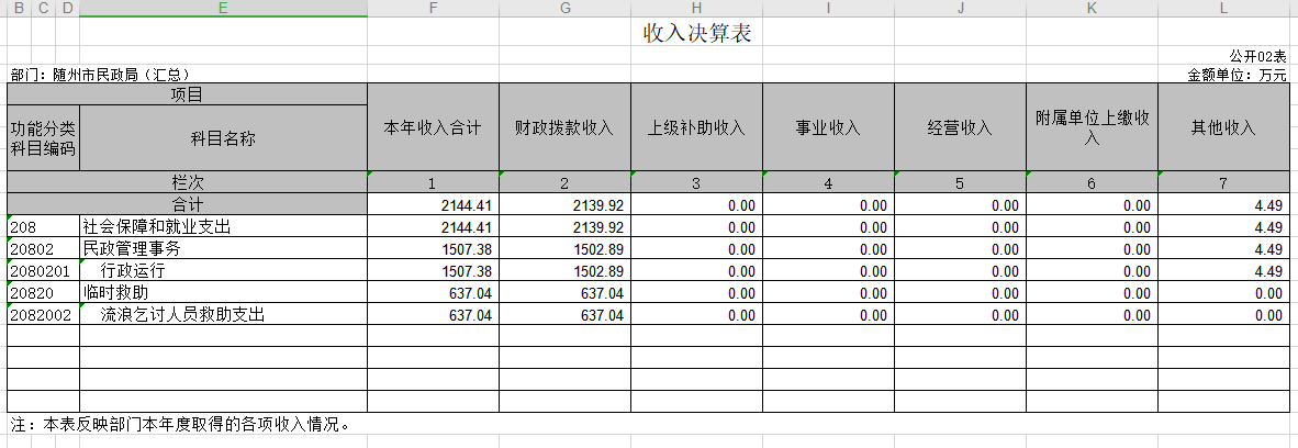? 隨州市民政局(匯總)2019年收入總計2851.69萬元,其中財政撥款收入2139.92萬元、其他收入4.49萬元、年初結(jié)轉(zhuǎn)和結(jié)余707.28萬元。收入合計較上年5012.12萬元降幅43.1%,主要原因:年初結(jié)轉(zhuǎn)結(jié)余減少,因機構(gòu)改革,項目資金減少。