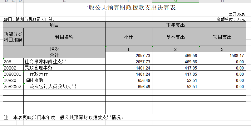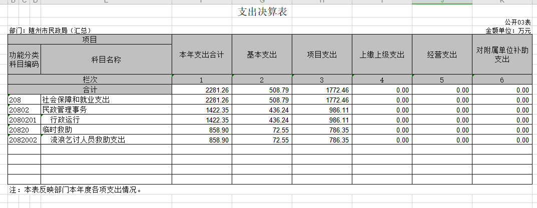 ? 隨州市民政局(匯總)2019年支出總計2851.69萬元,其中本年支出合計2281.26萬元、年末結(jié)轉(zhuǎn)和結(jié)余570.43萬元。支出合計較上年5012.12萬元減少43.1%,主要原因:因機構(gòu)改革,項目資金減少。