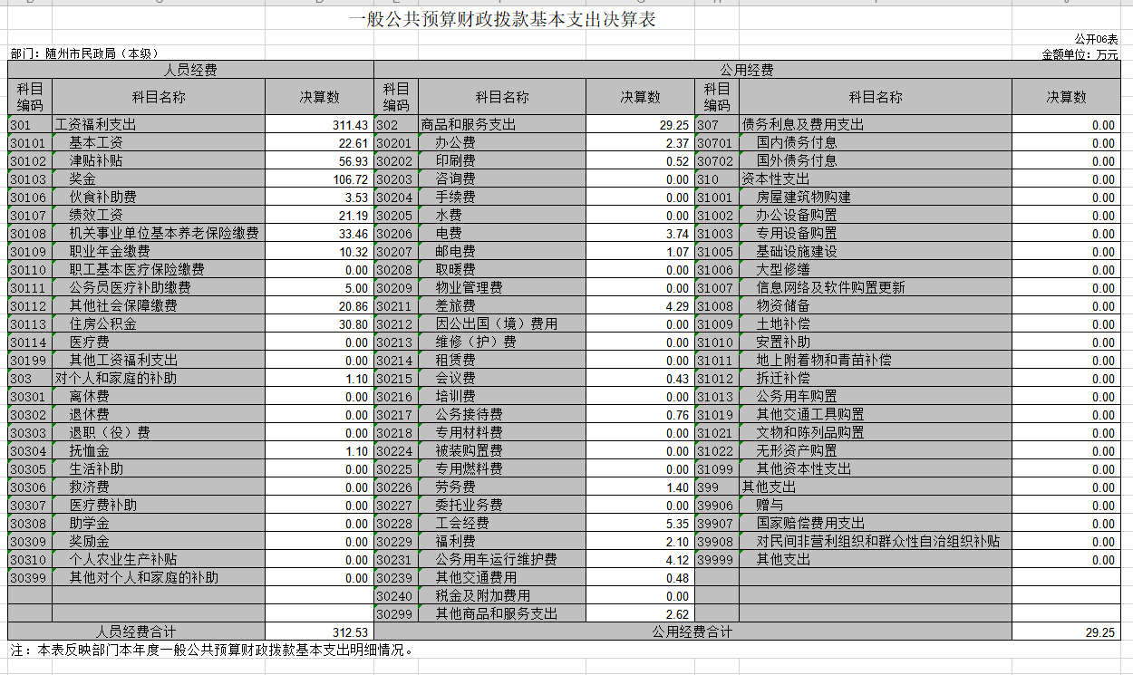 ? 隨州市民政局(匯總)2019年度一般公共預(yù)算財政撥款“三公”經(jīng)費支出年初預(yù)算數(shù)為31萬元,決算數(shù)為6.7萬元,比預(yù)算少24.3萬元,減少78.39%,決算數(shù)較上年的6.25萬元增加0.45萬元,漲幅7.2%,上下控制在10%內(nèi)。主要原因為無因公出國開支,嚴格控制三公經(jīng)費。其中:(1)2019年初預(yù)算因公出國(境)費用8萬元,2019年度實際支出0萬元;(2)2019年初預(yù)算公務(wù)接待費4.56萬元,2019年度實際支出1.28萬元(共接待次數(shù)22次,接待人次115人),比預(yù)算減少3.28萬元,減少71.93%;(3)2019年年初預(yù)算公務(wù)用車費18.44萬元,2019年度實際支出公務(wù)用車運行維護費5.42萬元,比年初預(yù)算減少13.02萬元,減少70.61%。