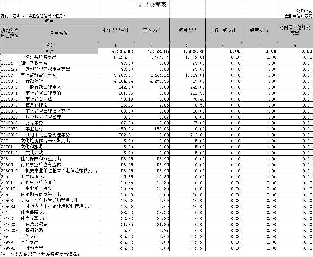 1、系統匯總:支出6535.01萬元,比上年減少1064.49萬元,下降14%,比年初預算減少1784.12萬元,下降21.44%。其中:人員經費支出4150.32萬元,占決算的63.5%;公用支出609.4萬元,占決算的9.3%;項目支出790.72萬元,占決算的12.09%;資本性支出984.56萬元,占決算的15.06%。