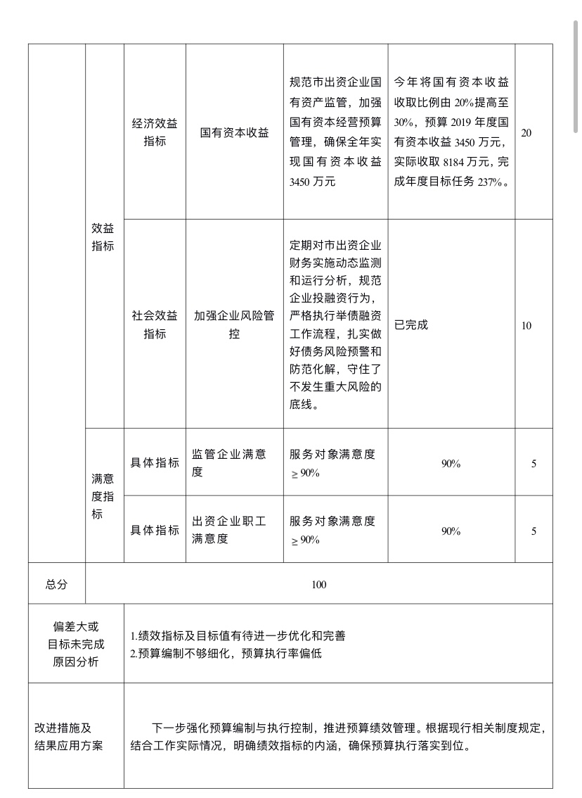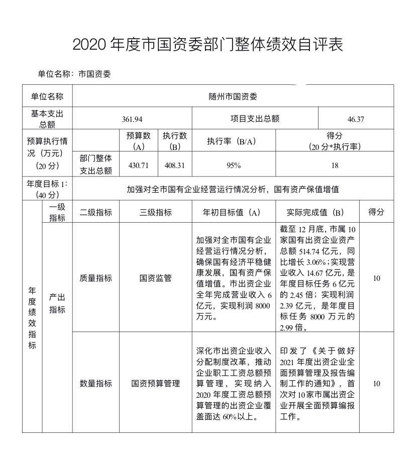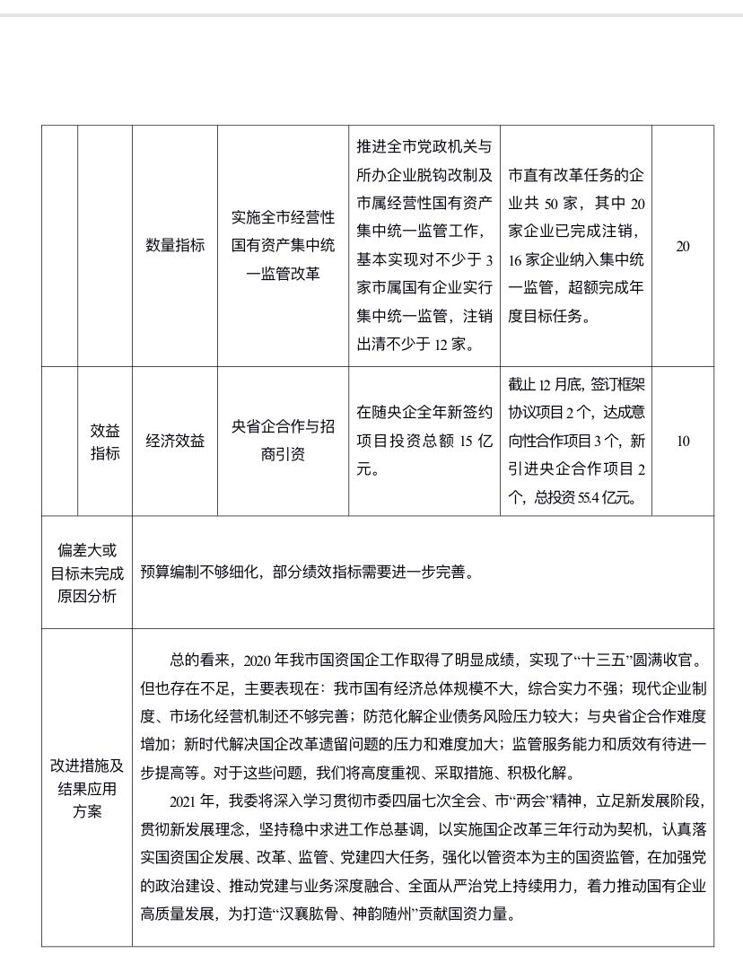 主要產出和效益:1.國有資產保值增值截至12月底,市屬10家國有出資企業資產總額514.74億元,同比增長3.06%;實現營業收入14.67億元,是年度目標任務6億元的?2.45倍;實現利潤2.39億元,是年度目標任務8000萬元的2.99倍;上繳2019年度國有資本經營收益8184萬元,是年度目標任務3450萬元的2.37倍。2.加快市級平臺公司優化整合、轉型發展。以市城投公司和市建投公司為基礎新組建隨州國投公司?,F隨州國投公司領導班子成員已經配備到位,公司登記注冊已完成,市政府同意將市城市排水公司等10家企業整合到隨州國投公司,支持隨州國投公司發展的一攬子措施已報市政府擬上政府常務會審議通過,屆時該公司將步入高質量發展快車道。3.央省企合作與招商引資成效顯著。截止12月底,簽訂框架協議項目2個,達成意向性合作項目3個,新引進央企合作項目2個,總投資55.4億元。4.經營性國有資產統一監管市直有改革任務的企業共50家,其中20家企業已完成注銷,16家企業納入集中統一監管,超額完成年度目標任務。我市經營性國有資產集中統一監管改革走在省內市州前列,成功做法與經驗得到省國資委的肯定與表揚,已初選申報為全省國資國企改革工作交流項目。