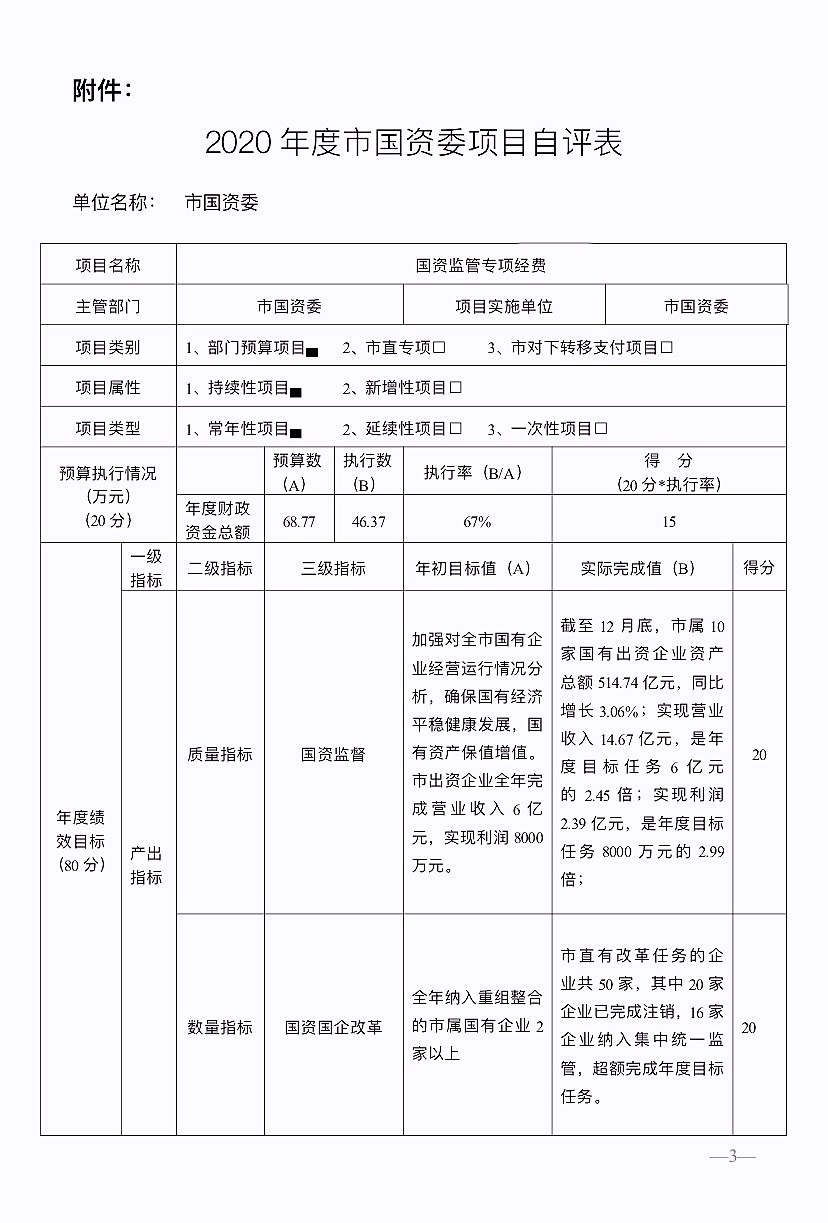 主要產出和效益:1.國有經濟運行企穩向好。今年來,納入財務快報統計范圍的10家市出資企業經濟運行整體企穩向好,呈現復蘇回暖的態勢。從統計數據看,受新冠肺炎疫情影響,收入、利潤同比有所下降,但資產規模同比小幅增長,大部分企業開始轉虧為盈。2.全市經營性國有資產集中統一監管改革突破性推進。2020年,市直有改革任務的企業共50家,其中19家企業完成注銷,22家企業完成清產核資,首批劃轉13家企業的請示已報市集中監管改革工作領導小組簽批及市政府同意。各縣市區涉改企業171家,已基本完成改革任務24家。3.國有企業辦社會職能在克難中加快剝離。國企退休人員社會管理工作涉及我市10202人,制定印發實施方案,組織召開工作動員會,全面啟動并推進落實。央省企“三供一業”分離移交“掃尾”工作正在積極推進中。4.企業三項制度改革全面推進。深化市出資企業收入分配制度改革,實現納入2020年度工資總額預算管理全覆蓋。創新開展市出資企業全面預算管理工作。完成監管企業2019年度經營業績考核和國有資本收益征繳工作。