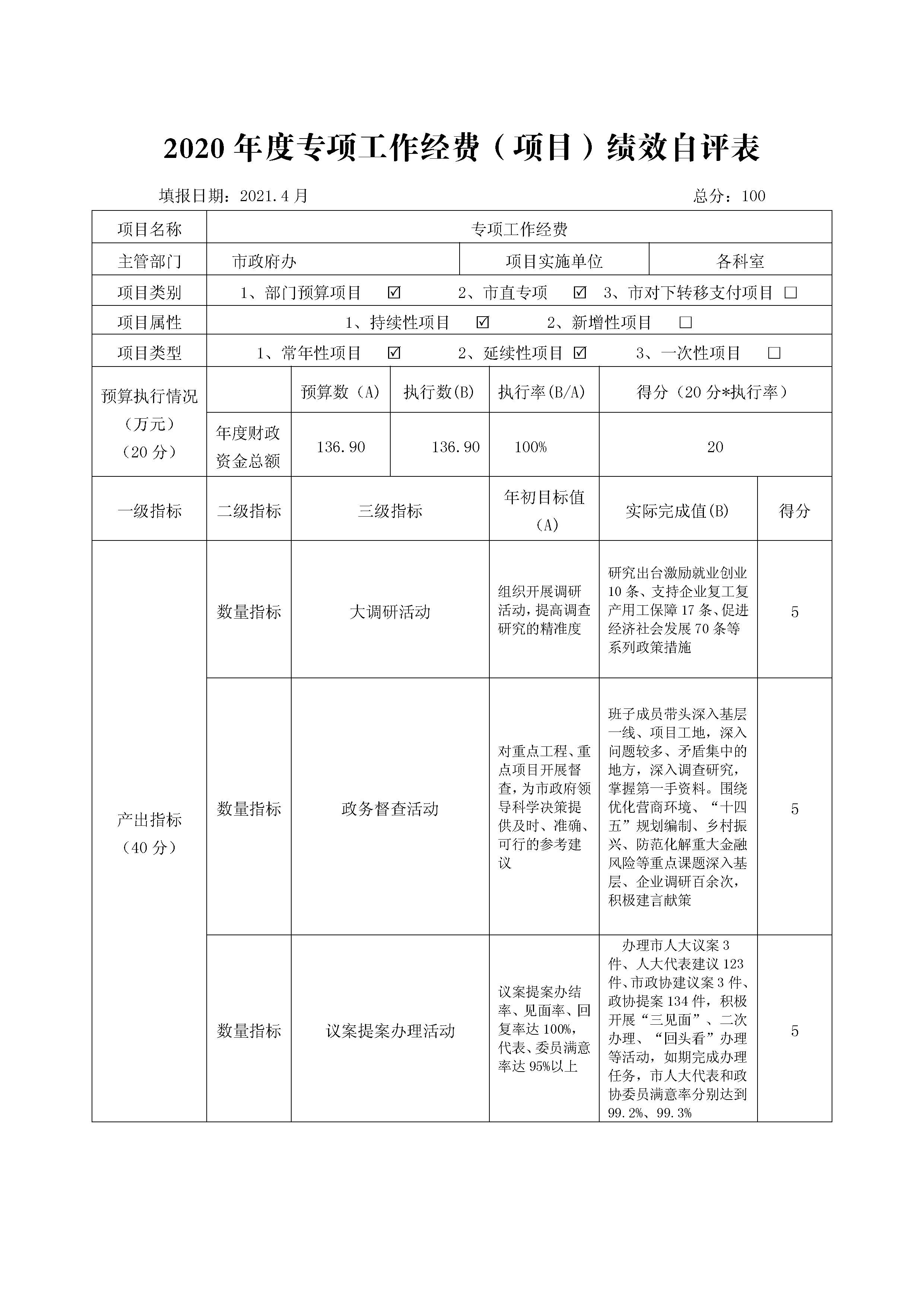 專項工作經(jīng)費預(yù)算下達項目資金136.90萬元,實際支出136.90萬元,完成預(yù)算100%。主要用于保障深化政務(wù)調(diào)研、強化政務(wù)督查、優(yōu)化信息化服務(wù)、規(guī)范文書處理、加強政務(wù)值守、做好會務(wù)服務(wù)、落實議案提案辦理、政府公報發(fā)行等工作經(jīng)費。產(chǎn)出指標、效益指標均按照年初編制績效評價表目標任務(wù)完成年初目標值。