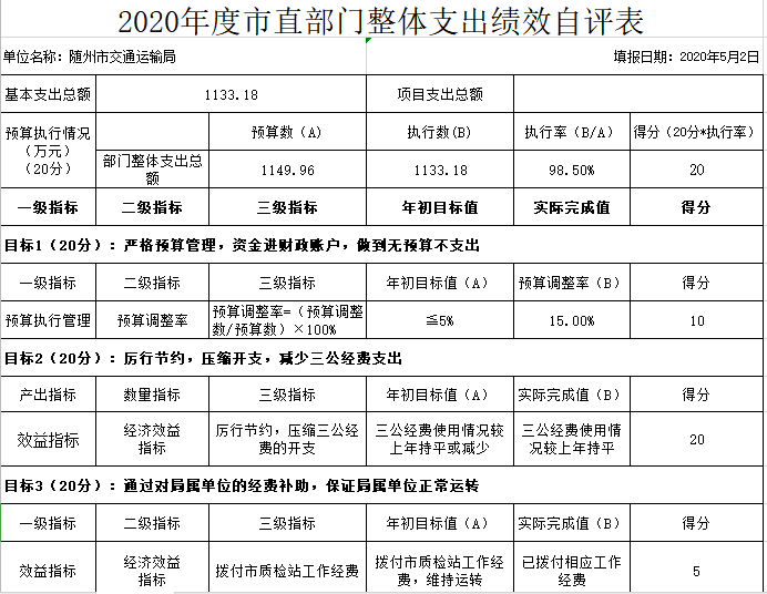 各部門(mén)應(yīng)當(dāng)按照如下格式說(shuō)明:根據(jù)預(yù)算績(jī)效管理要求,本部門(mén)組織對(duì)2020年度部門(mén)整體支出績(jī)效評(píng)價(jià),評(píng)價(jià)情況來(lái)看,整體支出績(jī)效評(píng)價(jià)自評(píng)得分為90分。