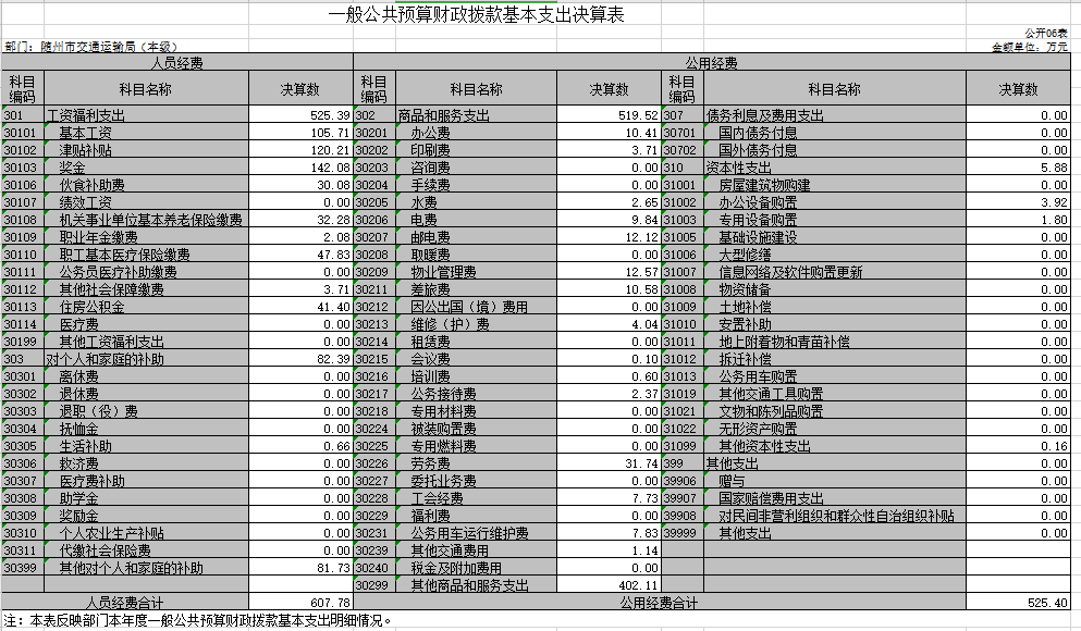 隨州市交通運(yùn)輸局(本級(jí))2020年度機(jī)關(guān)運(yùn)行經(jīng)費(fèi)525.4萬(wàn)元,比年初預(yù)算數(shù)減少6.6萬(wàn)元,降低1.24%;較上年359.04萬(wàn)元增加166.36萬(wàn)元,增幅46.33%。其中辦公費(fèi)10.41萬(wàn)元,印刷費(fèi)3.71萬(wàn)元,水費(fèi)2.65萬(wàn)元,電費(fèi)9.84萬(wàn)元,郵電費(fèi)12.12萬(wàn)元,物業(yè)管理費(fèi)12.57萬(wàn)元,差旅費(fèi)10.58萬(wàn)元,維護(hù)(修)費(fèi)4.04萬(wàn)元,公務(wù)接待費(fèi)2.37萬(wàn)元,勞務(wù)費(fèi)31.74萬(wàn)元,工會(huì)經(jīng)費(fèi)7.73萬(wàn)元,公車(chē)運(yùn)行維護(hù)費(fèi)7.83萬(wàn)元,其他交通費(fèi)1.14萬(wàn)元,其他商品服務(wù)支出402.11萬(wàn)元,上升的主要原因:對(duì)局屬單位撥款增加。
